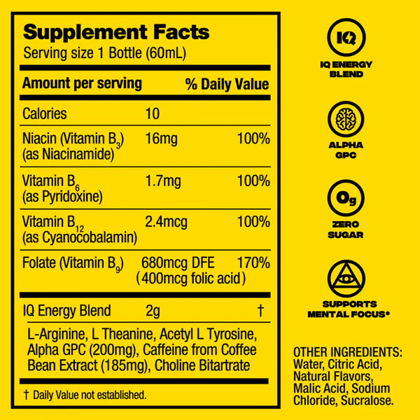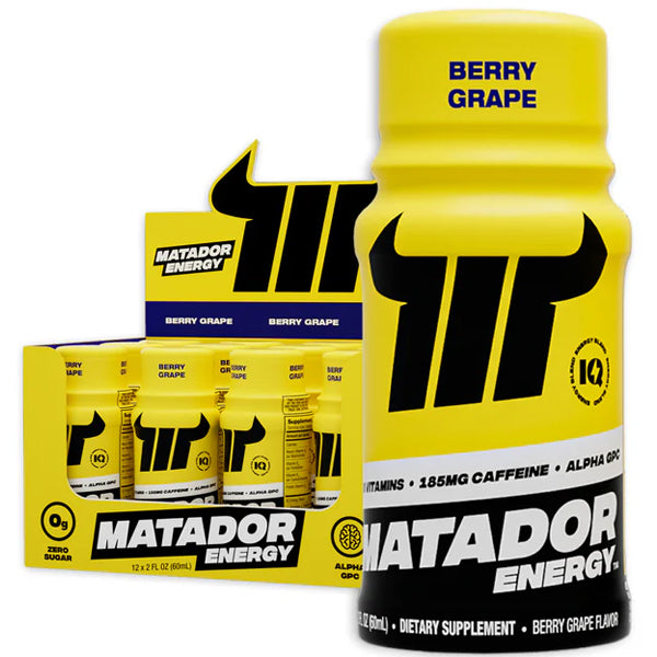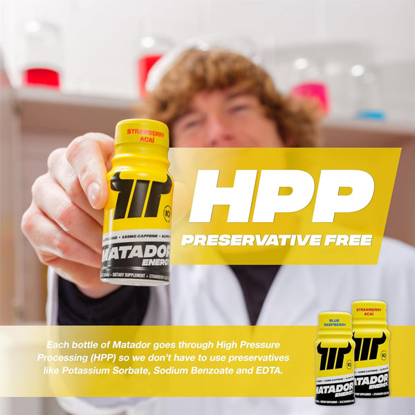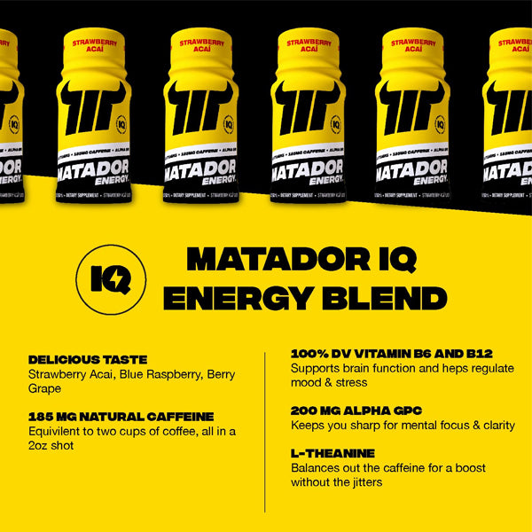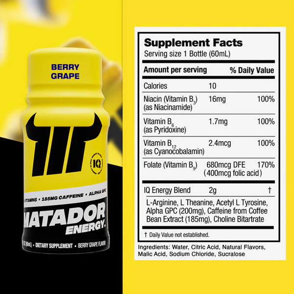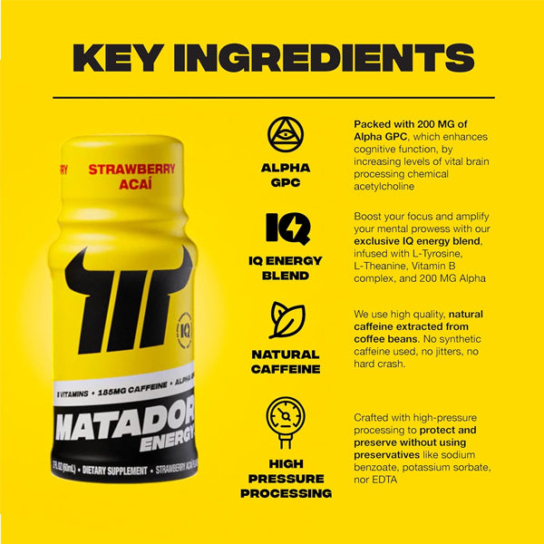 MATADOR ENERGY shots, is deliciously tart and naturally flavored. It has 185mg of natural caffeine from coffee bean extract, 100% Vitamin B3, B6, B9, and B12. A nootropic mix to keep you sharp, with 200mg of Alpha GPC, L-Theanine and L-Tyrosine. High Pressure Processed, so NO Sodium Benzoate no Potassium Sorbate, just delicious taste and focused energy.