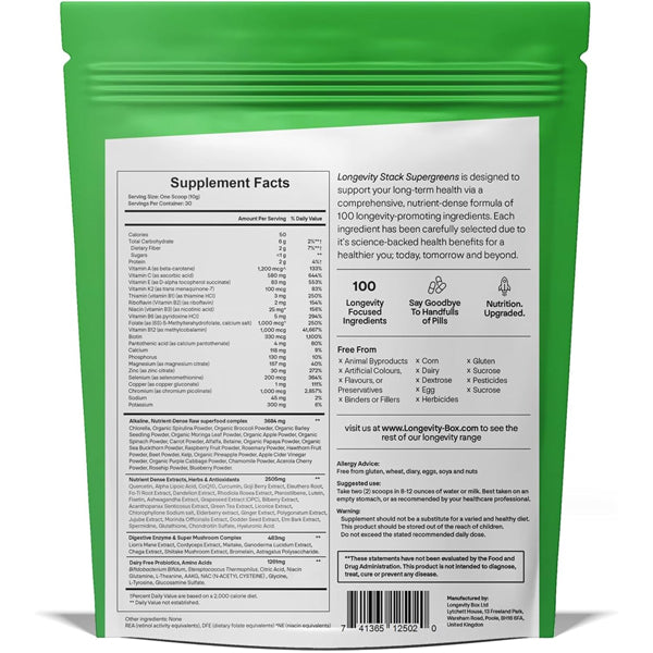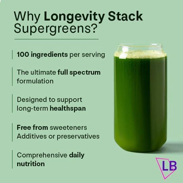 Embrace the benefits of Longevity Stack Supergreens as part of your journey towards optimal health. Perfect for individuals who appreciate the balance of convenience and comprehensive nourishment, this supergreens product provides a vibrant addition to support your wellness goals.