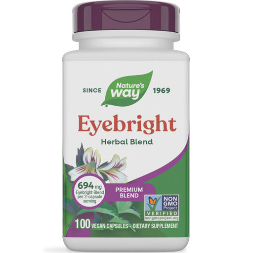 Nature's WayEyebright contains an herbal blend of eyebright, raspberry, and cayenne.694mg per 2 Capsule servingDairy Free | Vegan | Vegetarian