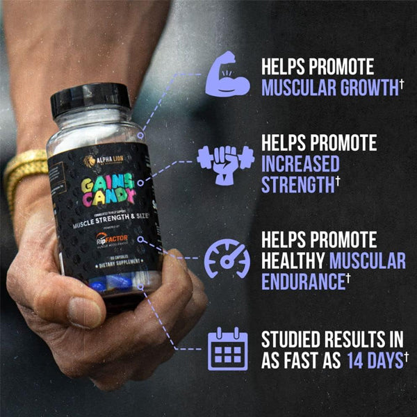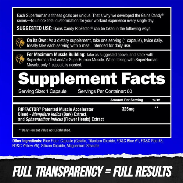 Gains Candy RipFactor® (60 servings) is the unmatched muscle-builder for concentrated muscle growth. Studies have shown significant increases in both muscle size & overall body strength in as fast as 14 days.†