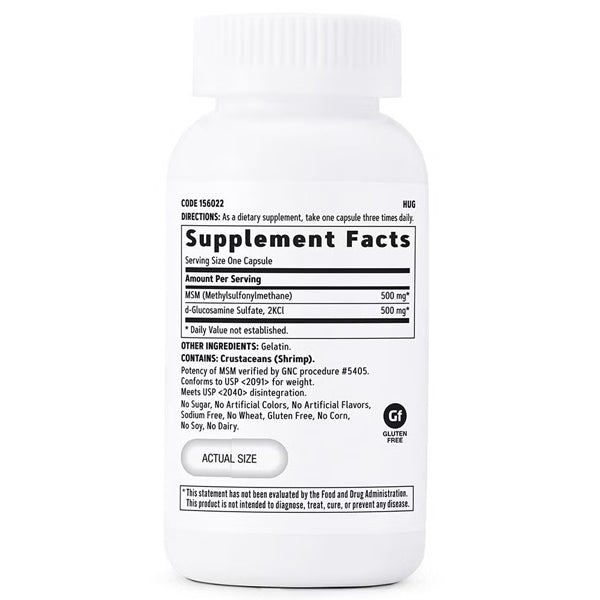 GNC MSM/Glucosamine capsules are taken daily to support joint function and joint cartilage health. MSM is also known as Methylsulfonylmethane and is a naturally occurring compound that serves as a source of sulfur, an essential component of joint cartilage. Free of gluten, wheat, corn, soy and dairy so those with allergies or sensitivities can consider this an option. For the best results, take one capsule three times daily.