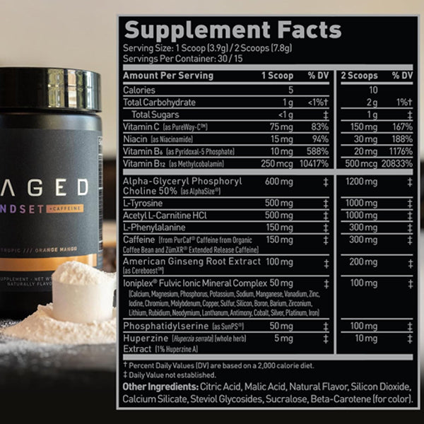 Kaged Mindset contains a powerful blend of 7 science-backed, premium ingredients including 300mg of caffeine for energy, 1,200mg of Alpha-GPC for cognitive function, 1,000mg of L-Tyrosine for focus, 1,000mg of Acetyle L-Carnitine for mental clarity, and 300mg of L-Phenylalanine for mood enhancement.