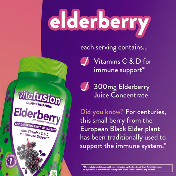 The tradition of using elderberry for immune support* is centuries old. Our Elderberry Gummy Supplement contains 225mg of Elderberry Juice concentrate plus 180mg of Vitamin C and 15mcg of Vitamin D per serving for immune support.* So, listen to your elders and try our Elderberry Gummy Supplement.