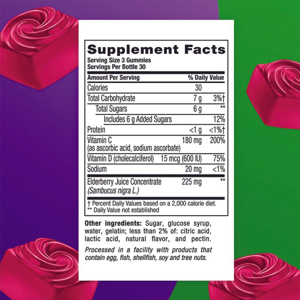 Each three-gummy serving of vitafusion™ Elderberry Supplement includes the following: